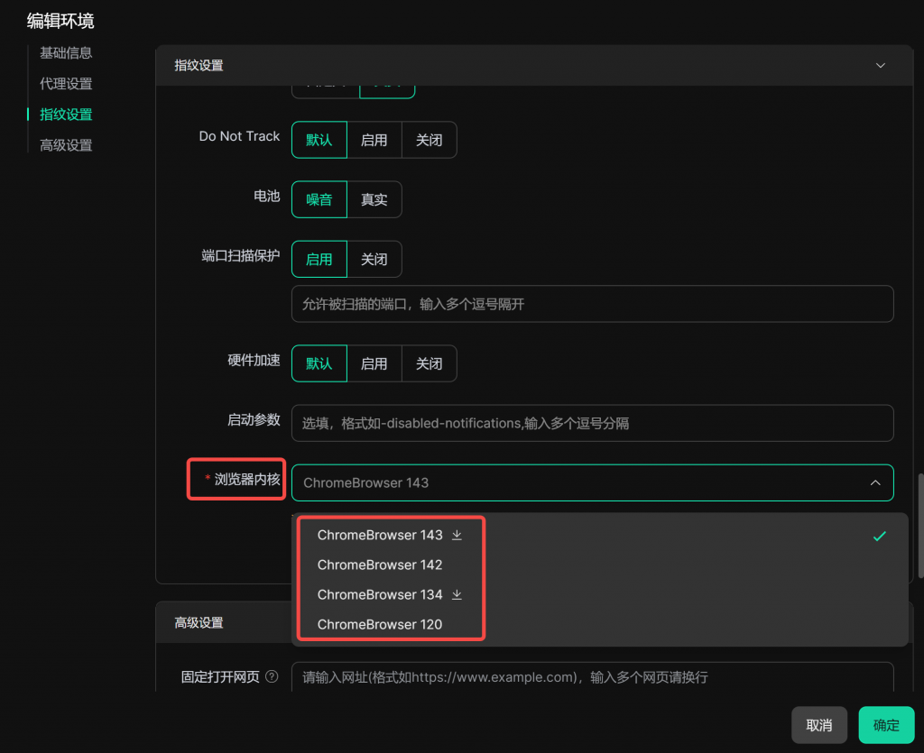 • 选择浏览器内核版本:默认选择142内核,如果您想要体验较新的浏览器版本建议选择143内核