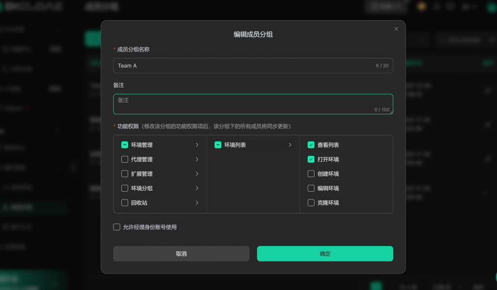 • 前往成员分组列表创建对应的成员分组并设置成员使用权限