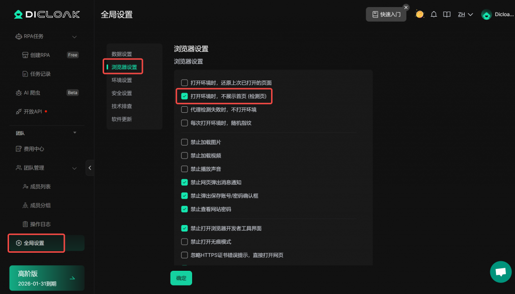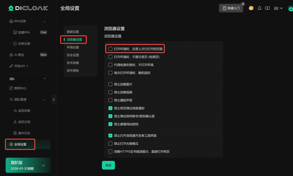 如果您不想要每次打开环境时都出现上次打开环境时访问的页面,请您前往【全局设置】,取消勾选【打开环境时,还原上次已打开的页面】