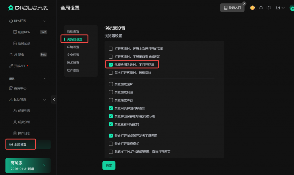 为了保持账号稳定,避免代理IP地址变动给账号带来风险,请您前往【全局设置】,勾选【代理检测失败时,不打开环境】