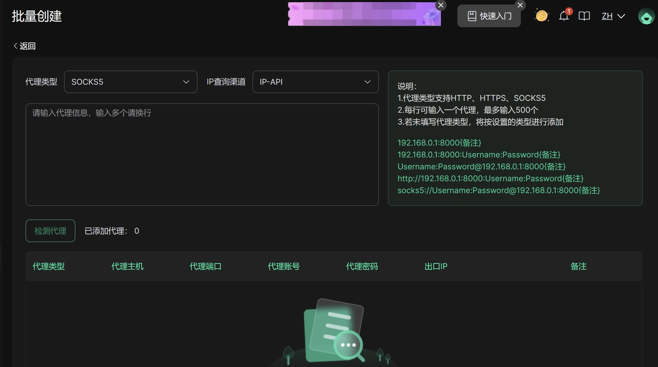 • 创建代理:前往【代理管理】创建代理,可单个创建或批量创建。
