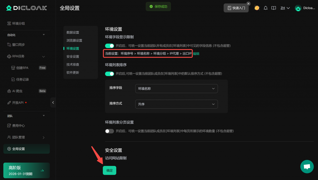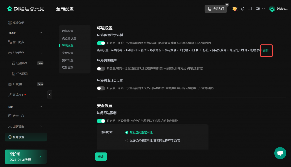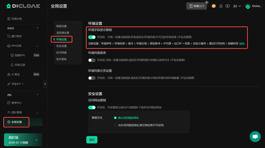 • 超级管理员可在【全局设置】中,在【环境设置】下找到【环境字段显示限制】,点击启用。