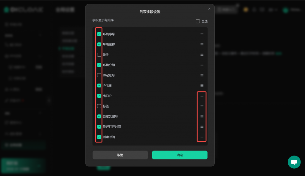 • 启用后,点击“编辑”,进入“列表字段设置”,可勾选您希望成员在环境列表中可见的字段,并拖动字段的显示顺序,最后点击“确定”。