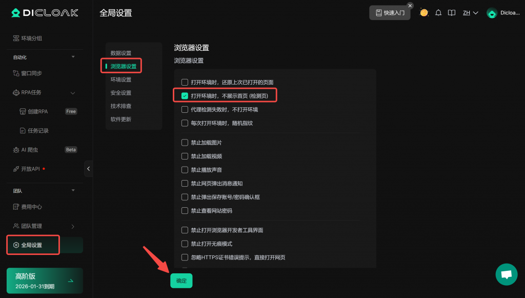 如不想展示首页,请在【全局设置】中,找到【浏览器设置】,勾选“打开环境时,不展示首页(检测页)”,点击“确定”保存设置。