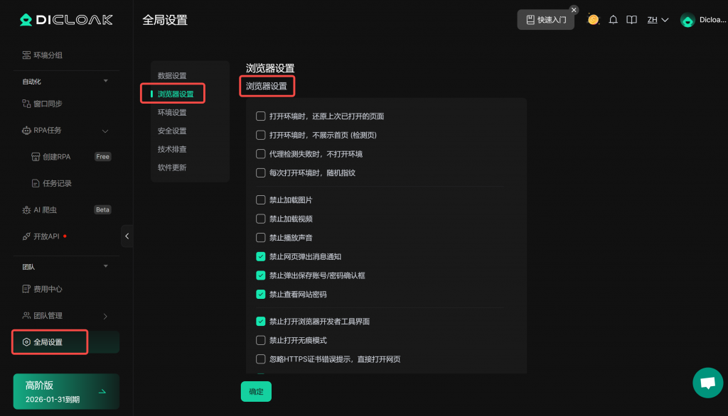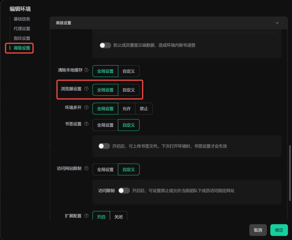 • 在【高级设置】下,将【浏览器设置】设为“全局设置”,则会按照上述【全局设置】中的设置内容生效。您也可以选择“自定义”,为该环境进行单独设置。