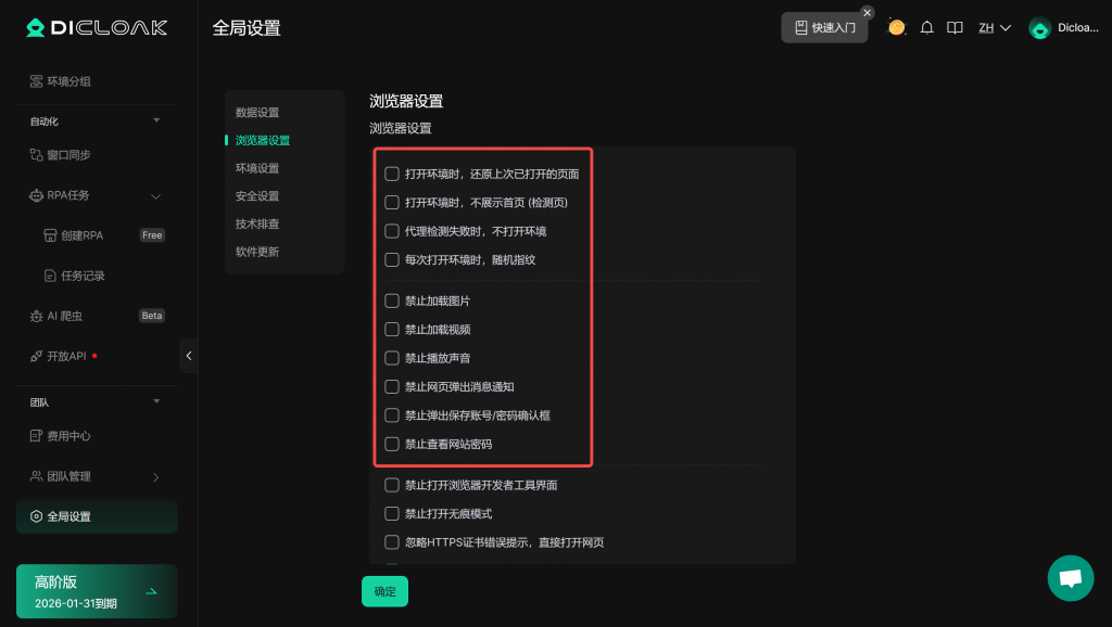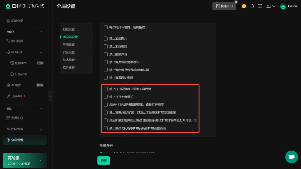 • 禁止打开无痕模式:如勾选,则环境浏览器无法打开无痕模式。