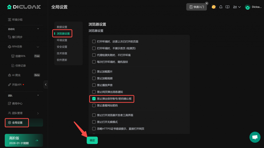 • 在左侧导航栏点击进入【全局设置】,在【浏览器设置】下勾选“禁止弹出保存账号/密码确认框”选项,并点击“确定”保存设置。