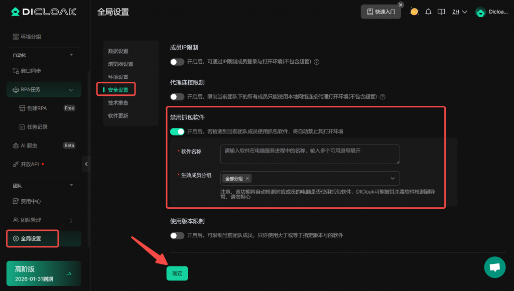 设置好【禁止抓包软件】后,若检测到当前团队成员使用抓包软件,将自动禁止其打开环境。可以防止您在开启了账号共享后,团队成员使用抓包工具进行账号密码等信息抓取,保护您的信息安全。如果您是免费版本,您需升级至任一付费版本来使用此功能。