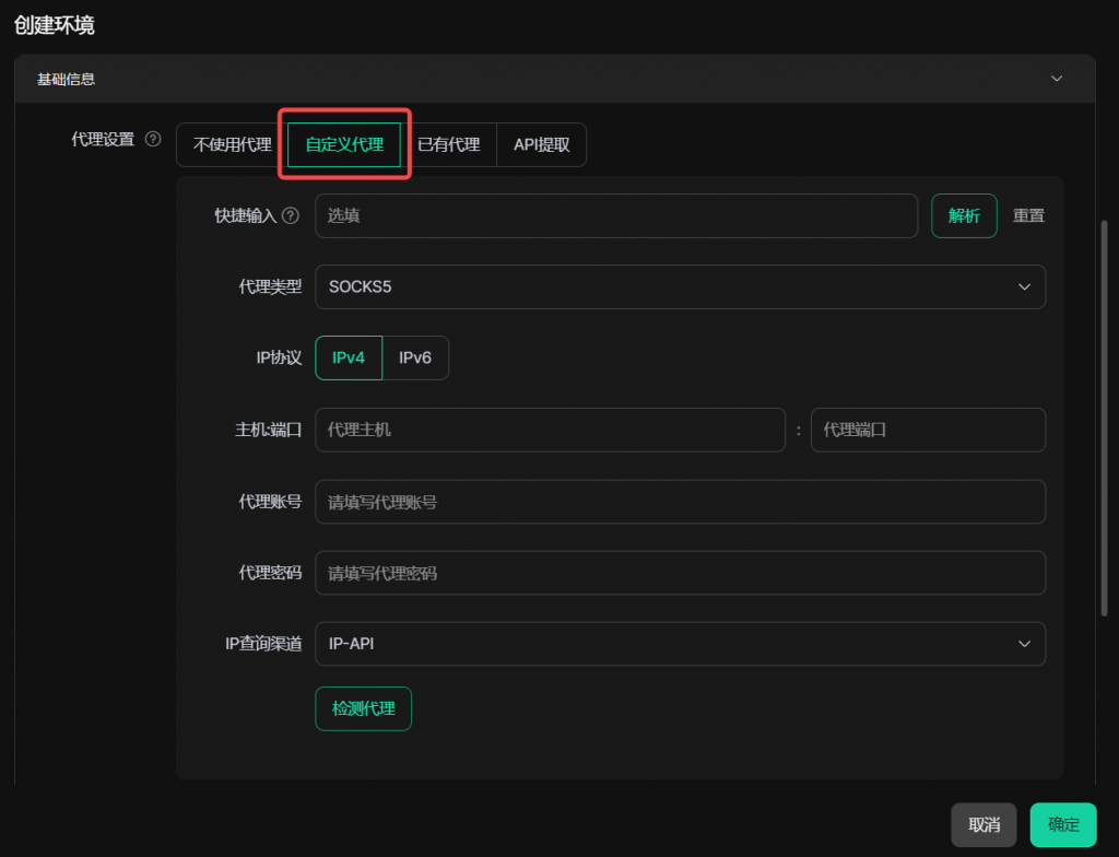 - 进入【创建环境】界面,在“代理设置”模块选择【API提取】,进入代理参数设置界面。