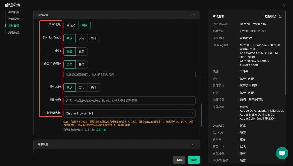 “编辑环境” 界面中的 “指纹设置” 部分,用于配置模拟浏览器的各项特征信息,这些指纹设置可全方位模拟真实设备与浏览器环境。