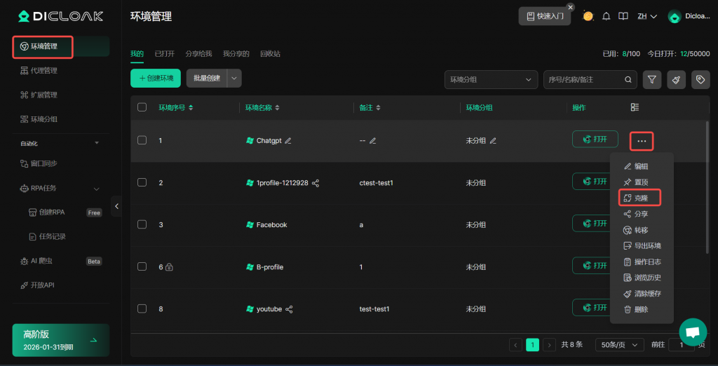 - 打开并登录DICloak软件,在左边导航栏找到【环境管理】,在环境右侧”…“处点击“克隆”。
