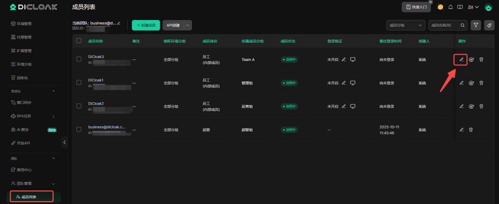 • 前往成员列表,找到要停用账号的成员,点击操作的编辑按钮