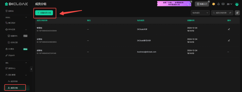 • 前往成员分组列表创建对应的成员分组并设置成员使用权限