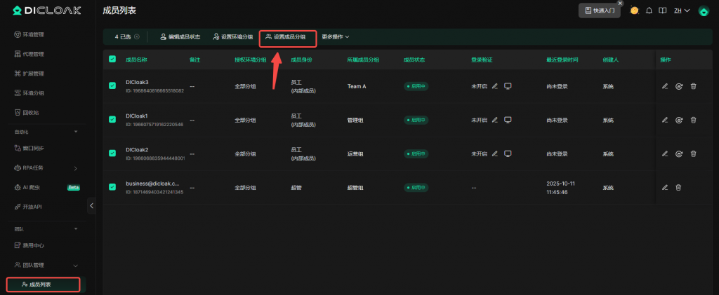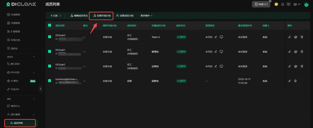 • 前往成员列表为成员分配对应的环境分组并保存设置即可