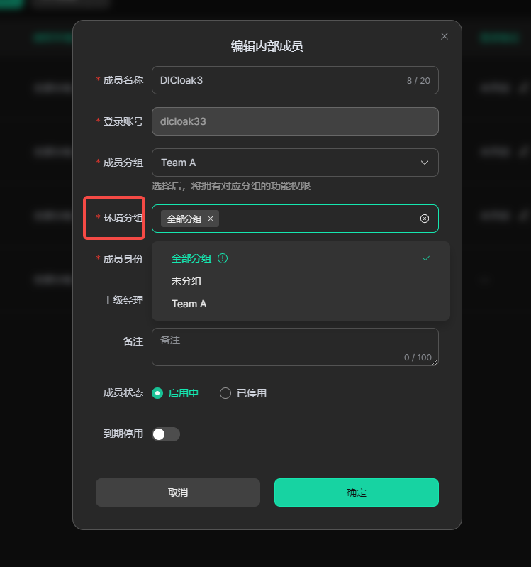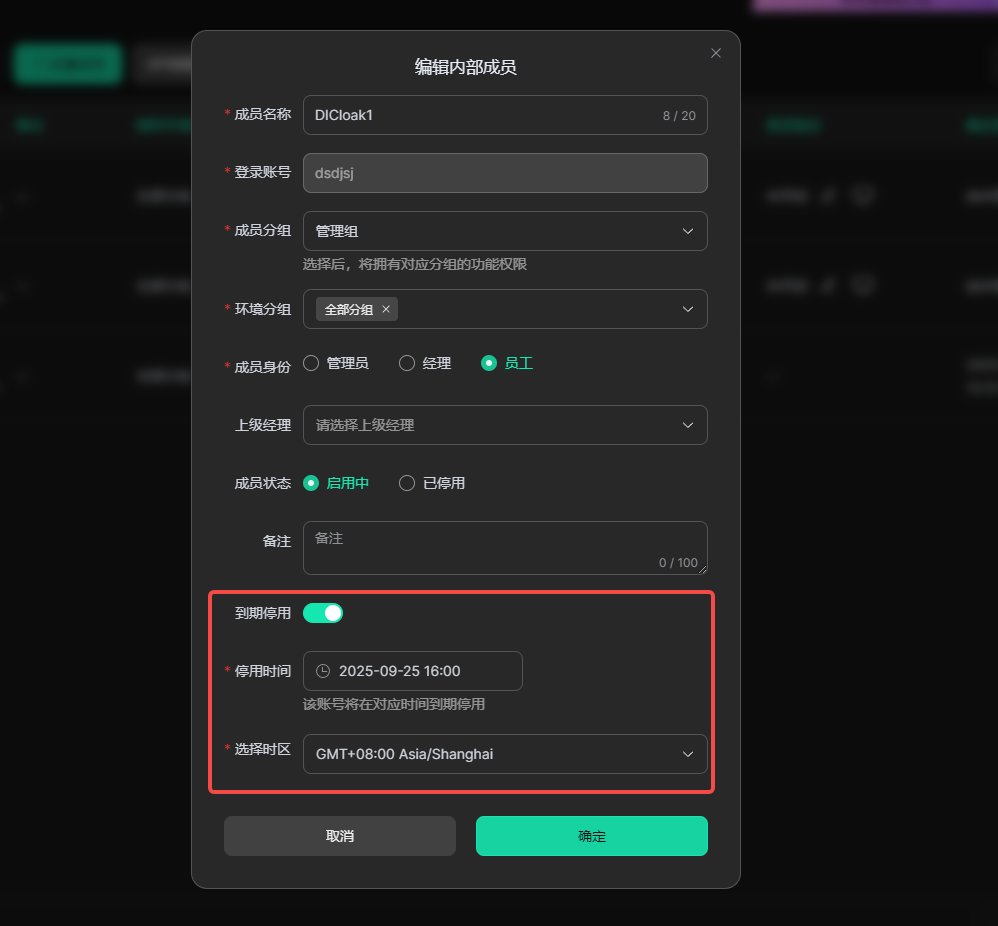 • 设置成员的到期停用时间
