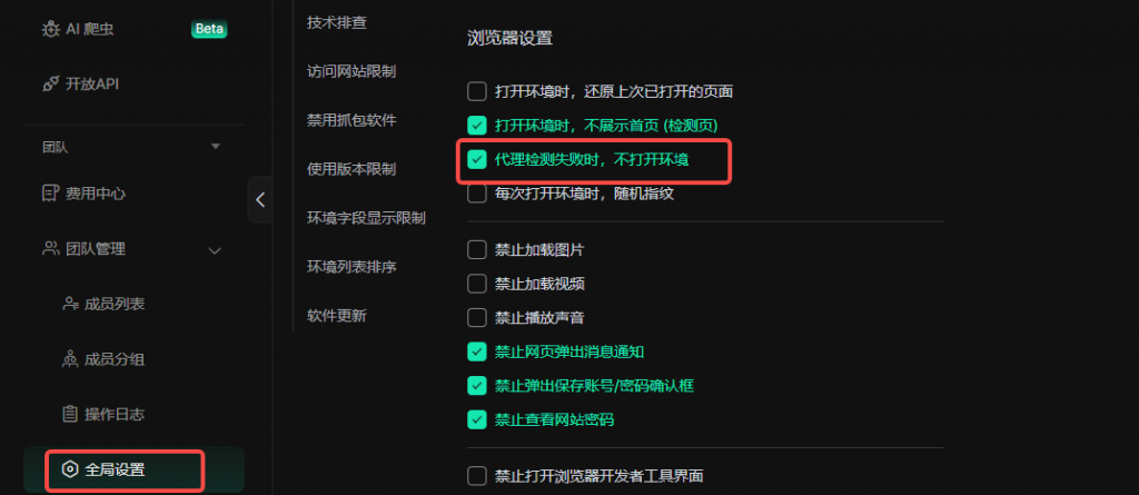 为了保持账号稳定,避免代理IP地址变动给账号带来风险,请您前往【全局设置】,取消勾选【代理检测失败时,不打开环境】