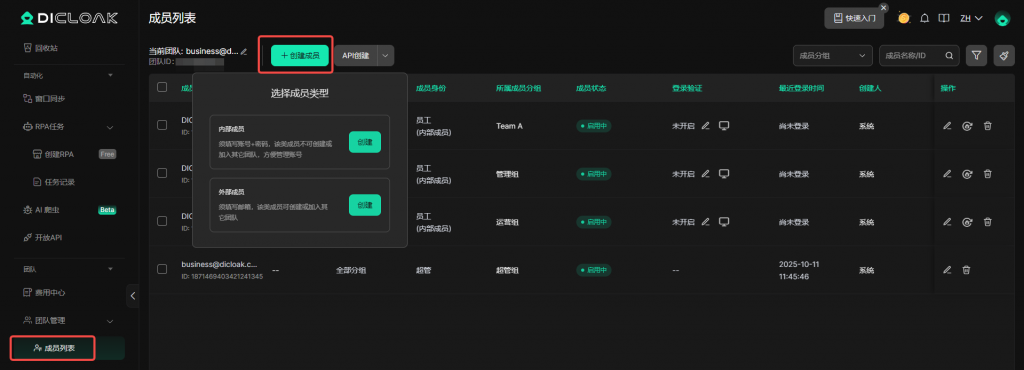 • 前往成员列表创建成员,可以根据自己的管理需求选择创建内部成员或者外部成员