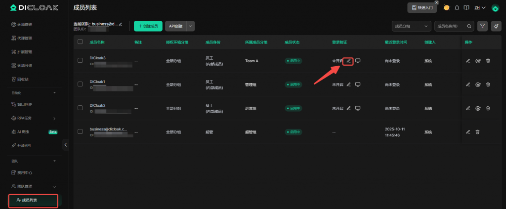 • 前往成员列表,找对要设置2FA验证的内部成员账号,找到登录验证,点击编辑按钮,然后开启2FA验证即可