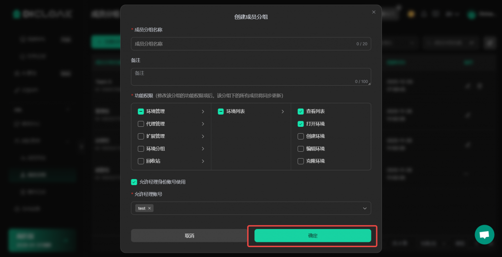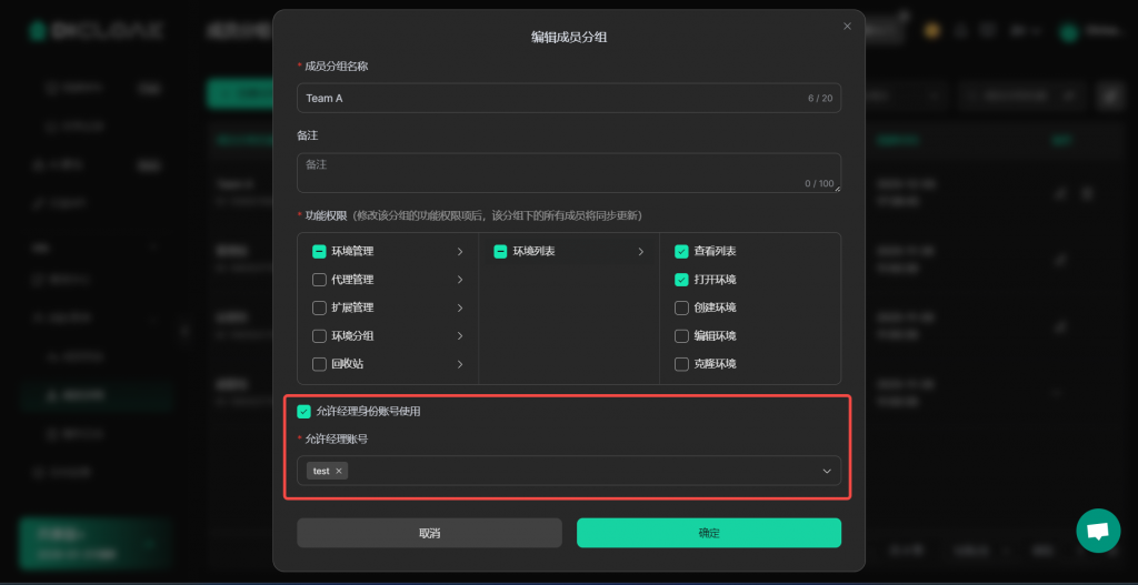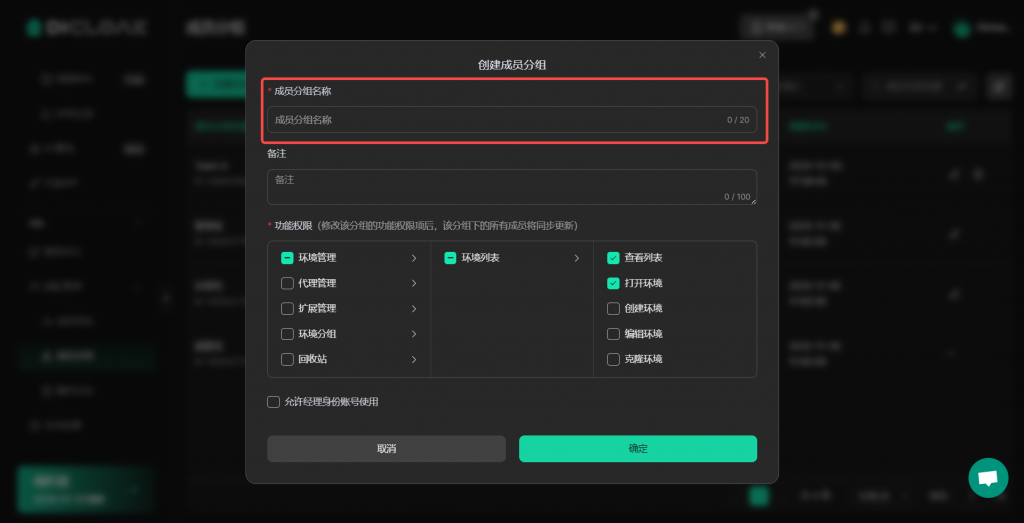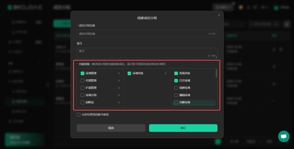 - 为分组设置对应的功能权限,可设置环境管理、费用中心以及团队管理方面的功能权限。勾选的功能是该分组可进行的操作,而没有勾选的功能则是该分组无法进行的操作。