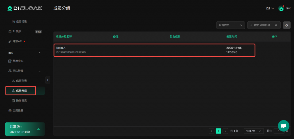 - 打开并登录DICloak软件,在左部导航栏找到【团队管理】,点击【成员分组】,然后点击【创建成员分组】开始新的分组创建。