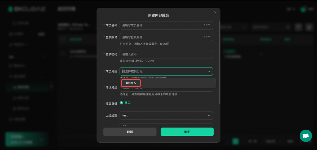 例如:成员分组“Team A”设置允许经理账号“小李”使用,则“小李”在【成员列表】创建成员时可选择“Team A”,在【成员分组】中可查看该分组的信息,其他无权限的成员分组则无法看到。