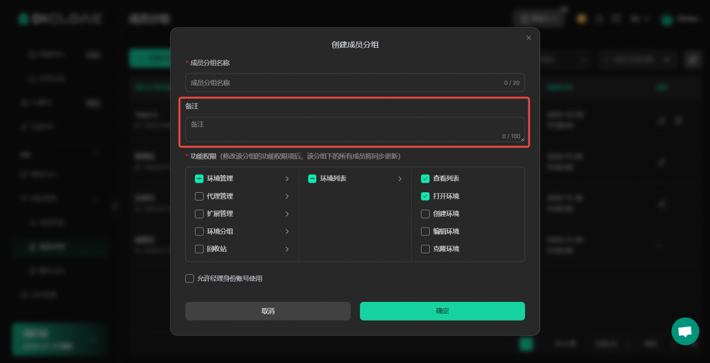 可选择是否勾选“允许经理身份账号使用”。如不勾选,则只有超管和管理员身份的账号可以查看和管理该成员分组。