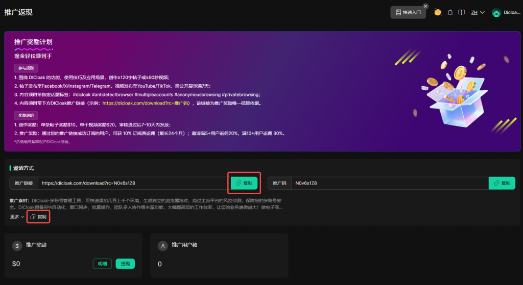 为了让喜欢并乐于分享DICloak的用户能有所有回报,DICloak上线推广返现功能啦!您只需复制推广链接,即可进行分享,只要您带来的用户订阅了套餐,您就能获得最高30%的推广佣金。除此之外,如果您能够在指定平台上发布帖子或视频介绍DICloak,还能有额外的创作奖励。一起来成为DICloak的合作伙伴吧!