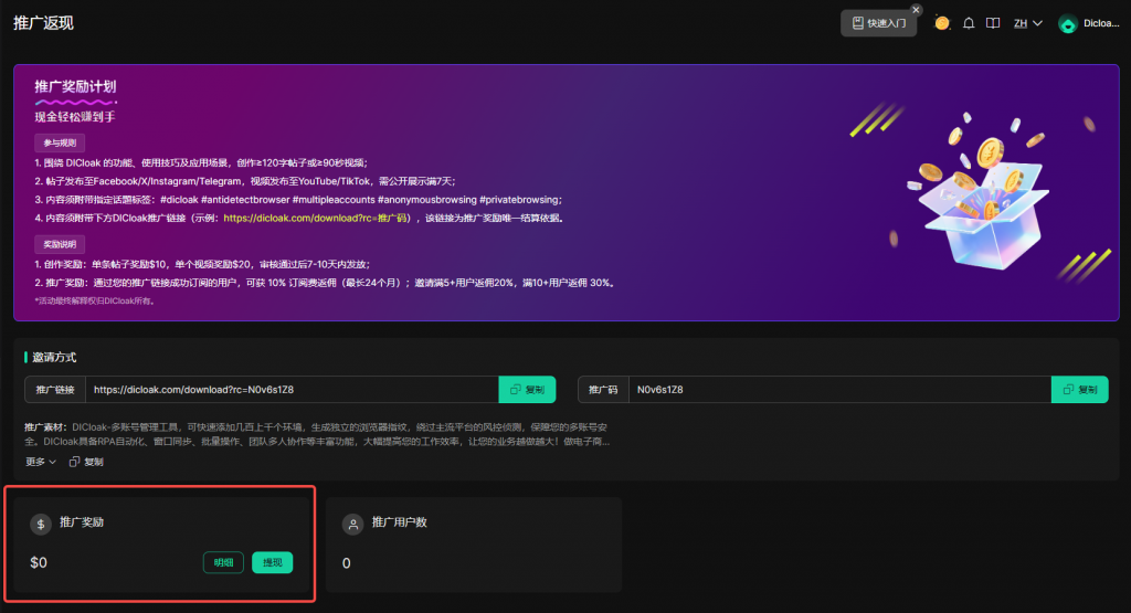 DICloak官网下载并打开DICloak软件,注册后登录DICloak账号,点击右上角头像找到并进入【推广返现