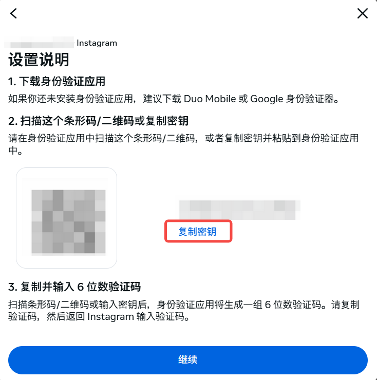 在工具平台上启动双重验证,并复制密钥,以Instagram为例: