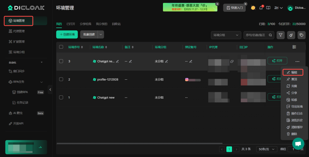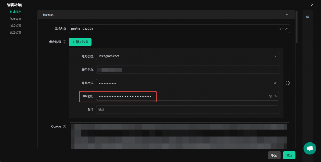 • 进入【环境管理】,点击编辑环境,添加账号信息,将平台上获取的2FA密钥填到对应位置
