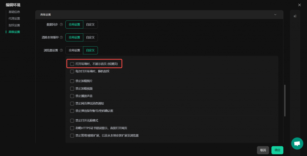 • 高级设置-浏览器设置,不可勾选“打开环境时,不展示首页(检测页)”,否则成员无法从检测页获取2FA验证码。