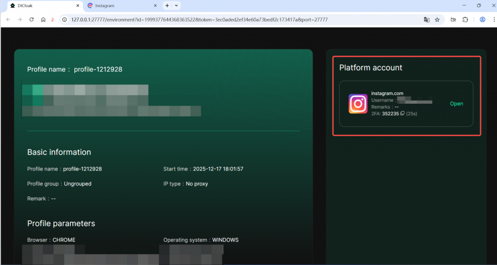 成员打开环境后,在DICloak检测页右侧可获取对应工具/平台账号的登录2FA验证码