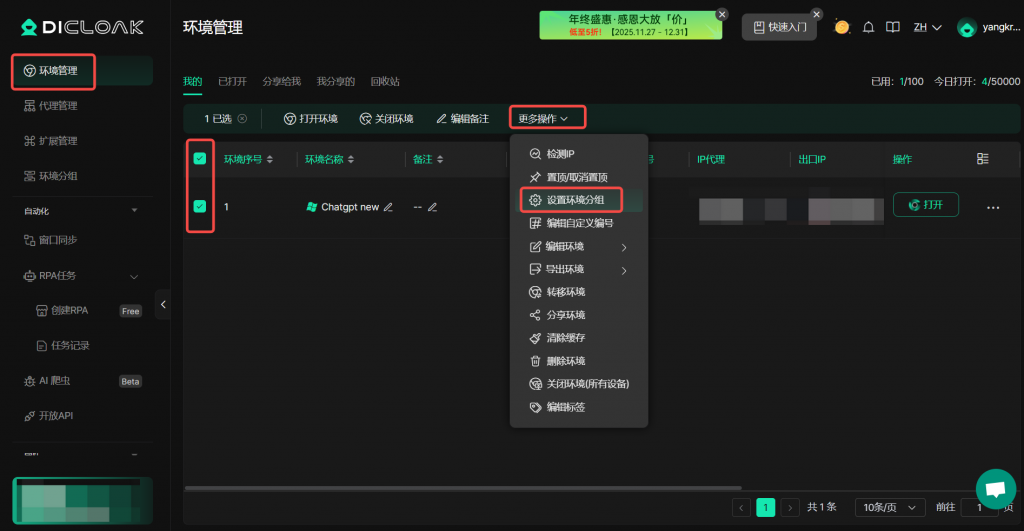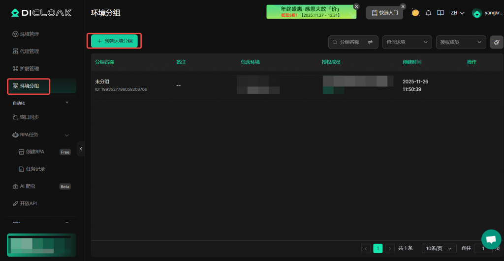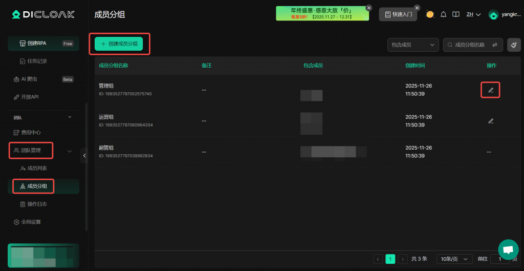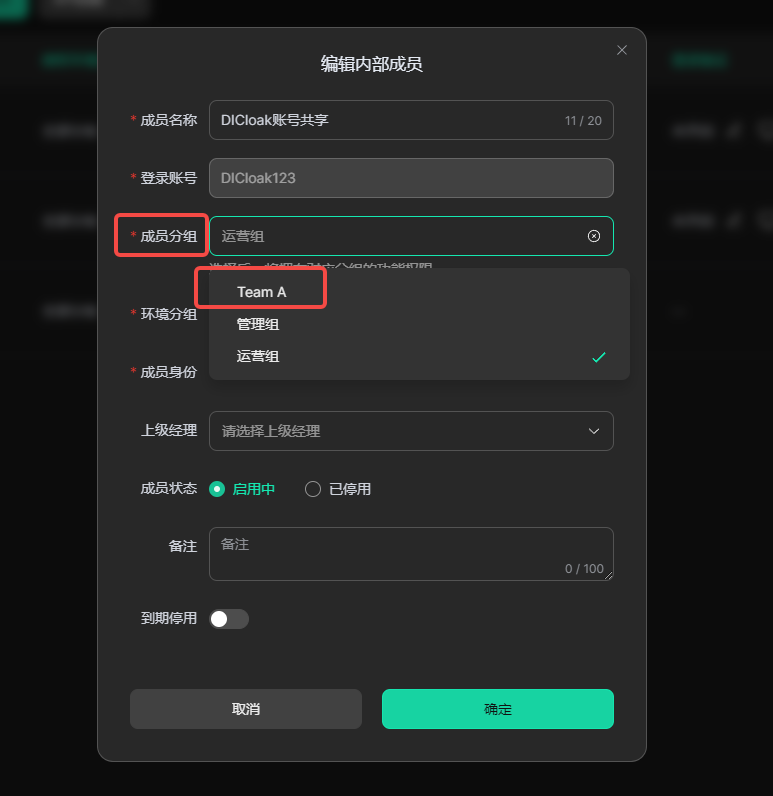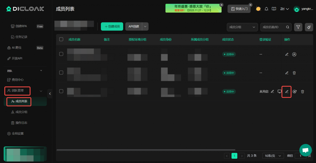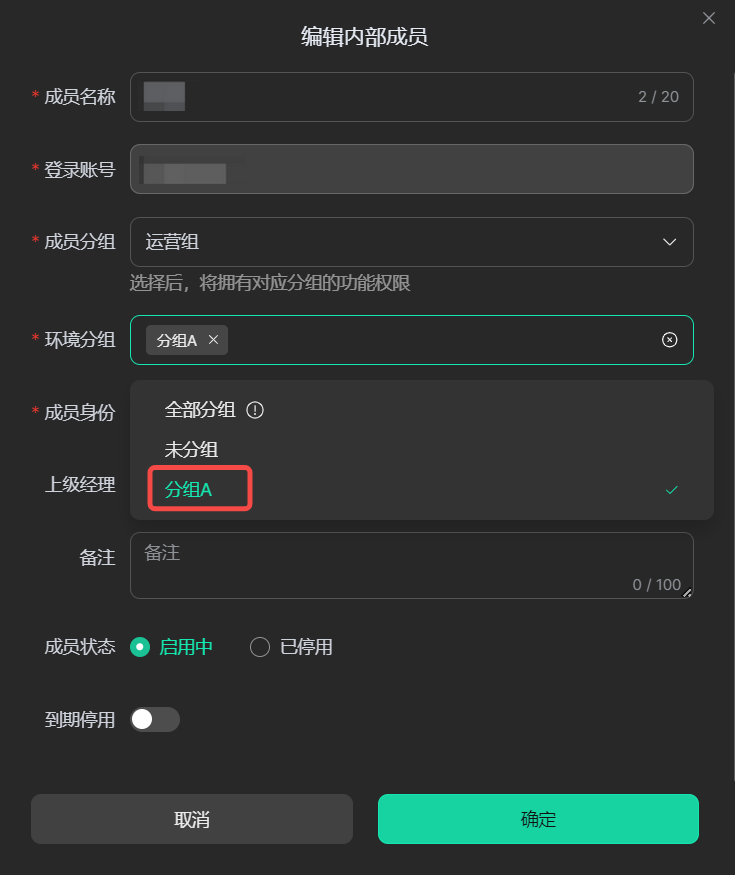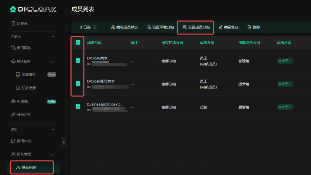 左边导航栏进入团队管理-成员列表,编辑或批量设置环境分组