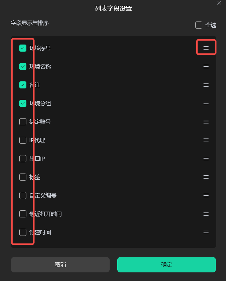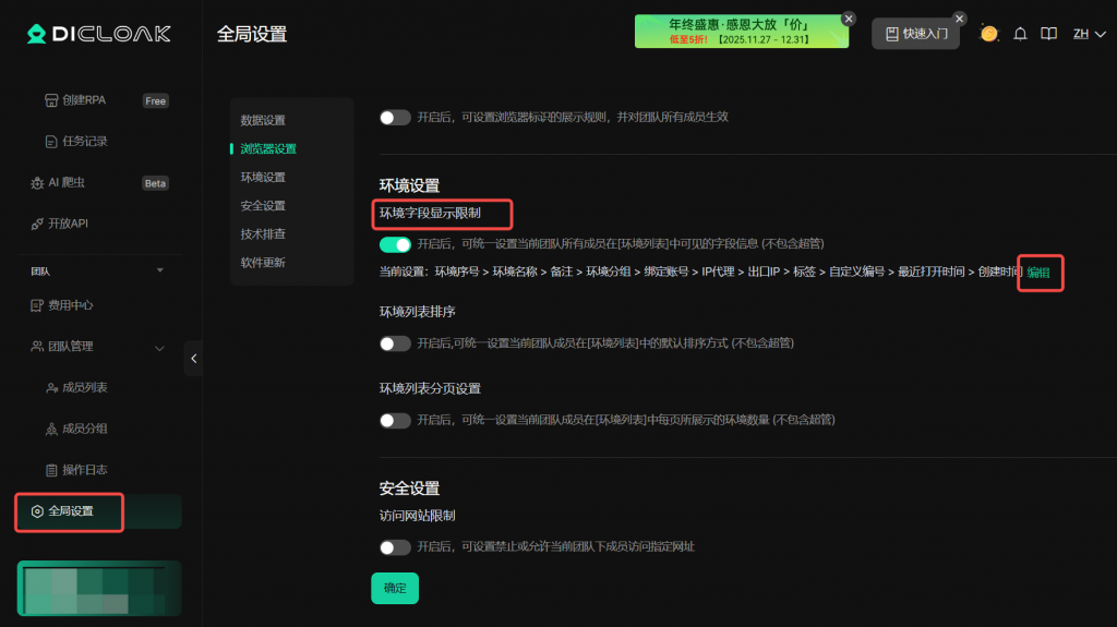 - 左边导航栏进入全局设置,在环境设置-环境字段显示限制中,点击编辑,勾选成员可见的环境字段,可进行排序,仅对超管以外的成员生效。