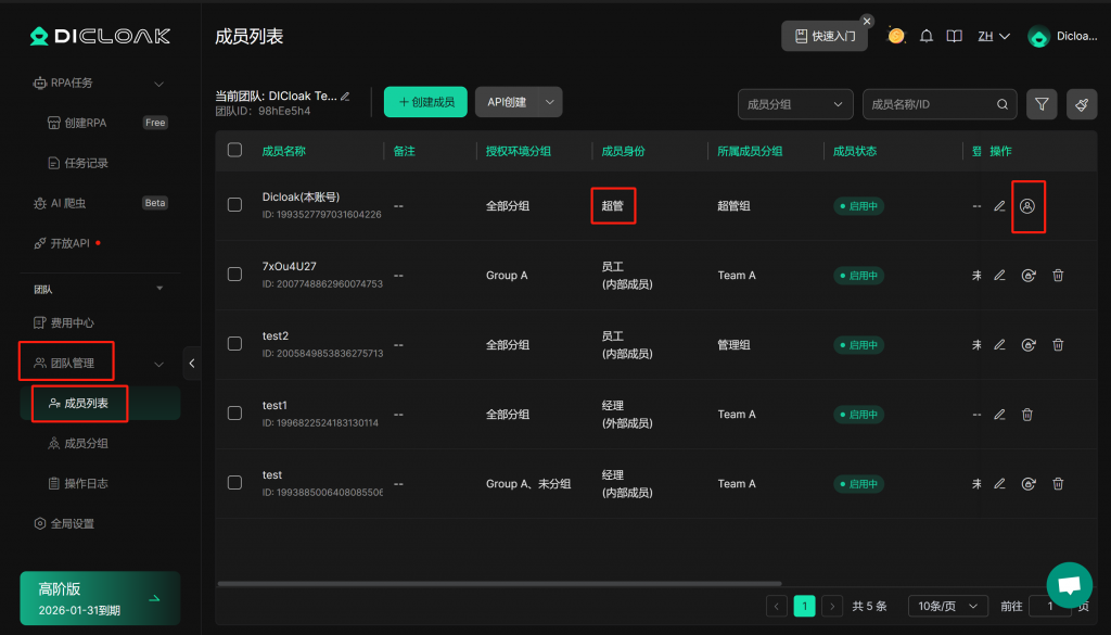 在DICloak,团队的最高操作权限为超管权限。正常来说,如果团队是由您创建的,那么您就会默认成为该团队的超管,超管只有一个。目前只有高阶版套餐支持转移超管权限。