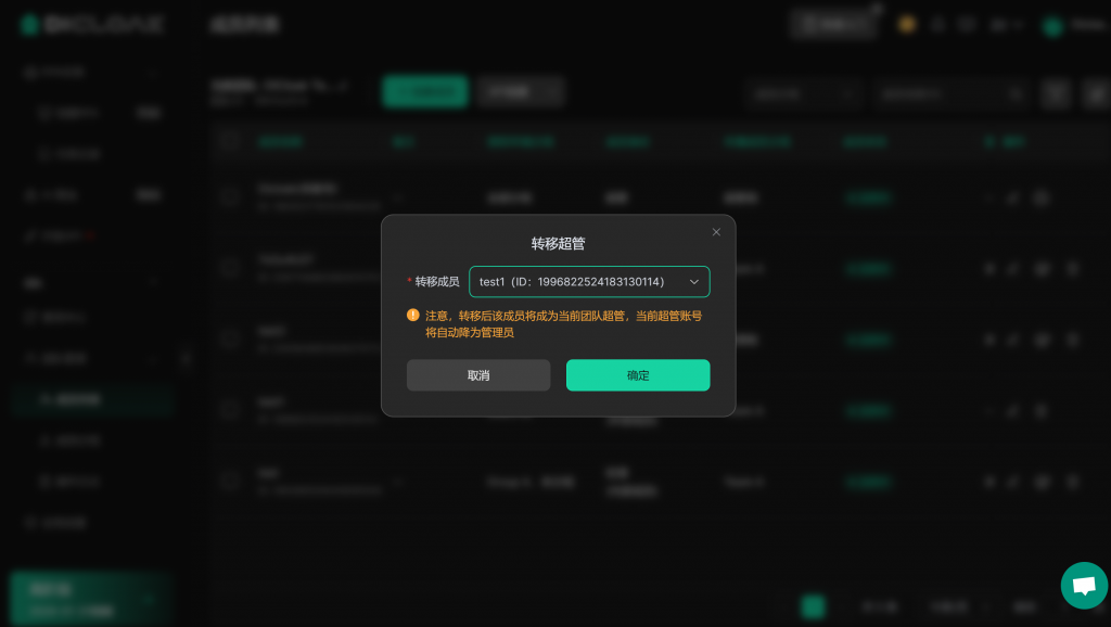 - 左边导航栏找到【团队管理】,进入【成员列表】。找到您的超管账号,点击【操作】处的“转移超管”图标。