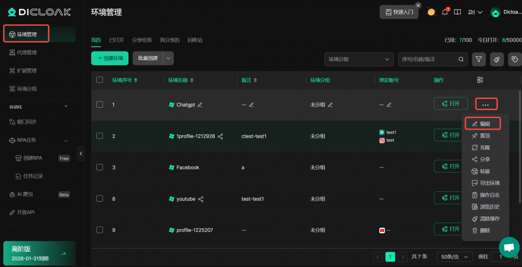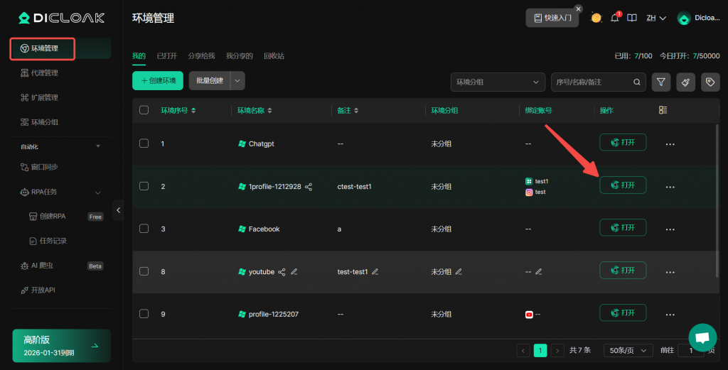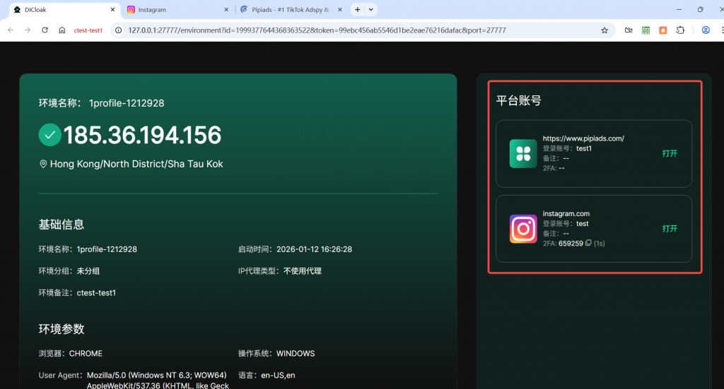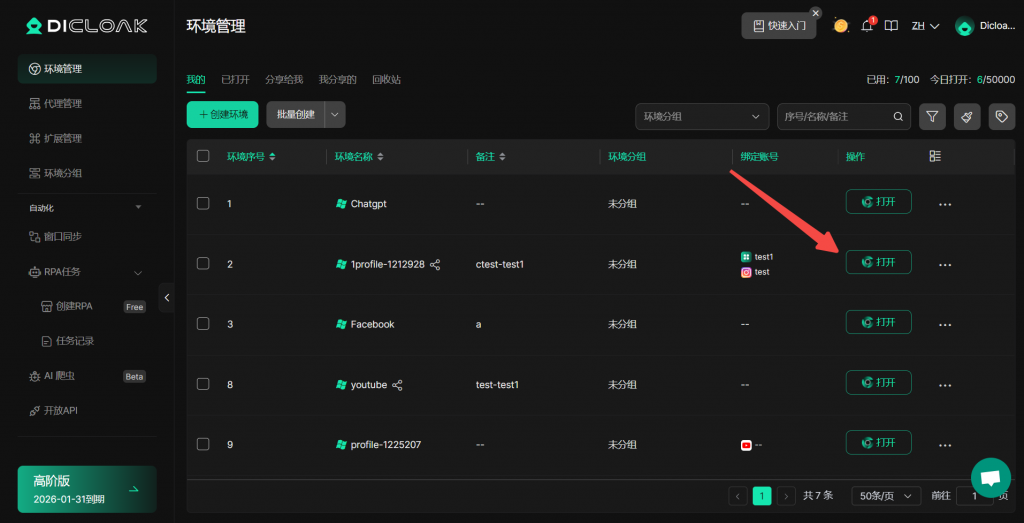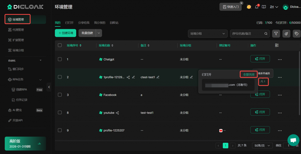 成员打开环境,在DICloak检测页可看到已添加的平台账号并点击“打开”