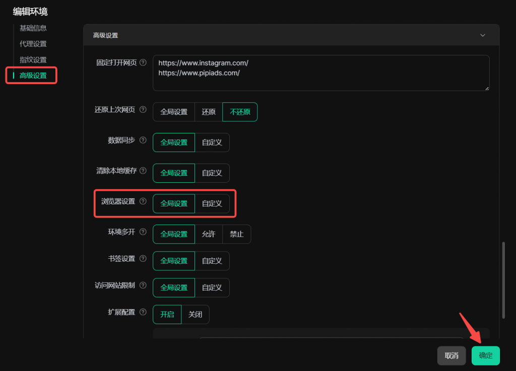 • 在【环境管理】中,点击“编辑”,在高级设置-浏览器设置 选择“全局设置”,点击“确定”保存设置