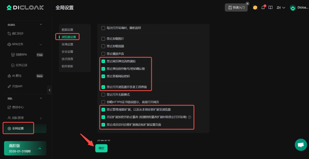 • 进入【全局设置】,在浏览器设置下,勾选“禁止网页弹出消息通知”、“禁止弹出保存账号/确认框”、“禁止查看网站密码”、“开启扩展加密并防止篡改”。点击“确定”保存设置。