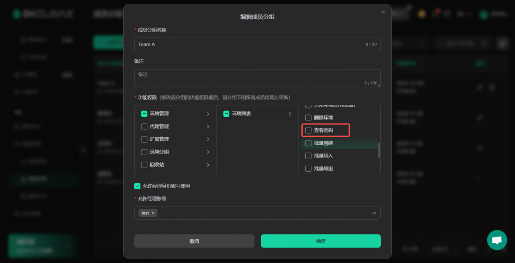 • 团队管理-成员分组,编辑成员所在分组的功能权限,不勾选“查看密码”权限
