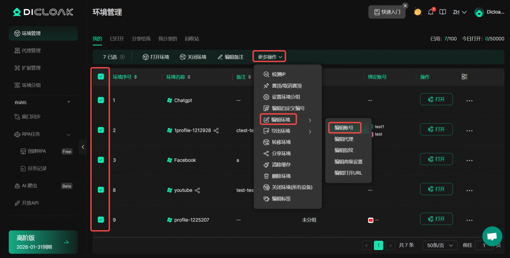 • 进入【环境管理】,“编辑”环境;或批量选择要添加同一账号的环境,点击“更多操作”-“编辑环境”-“批量编辑账号”