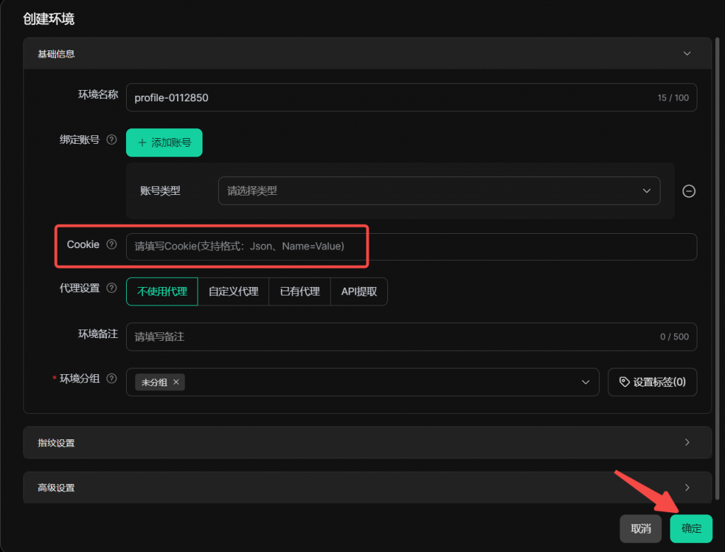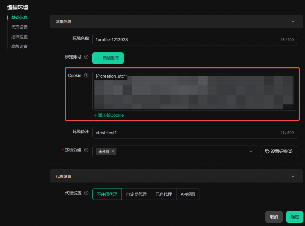 • 进入【环境管理】,“编辑”环境,将使用Cookie Editor导出的cookie信息全部复制到基础信息-Cookie中。点击“确定”保存设置。