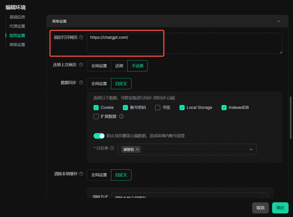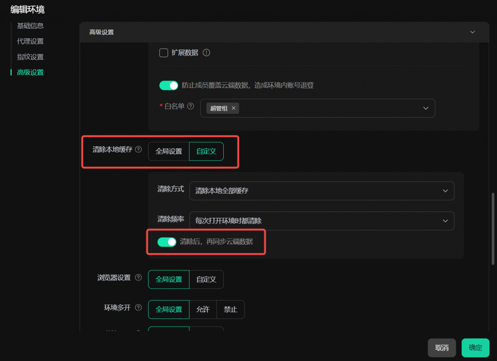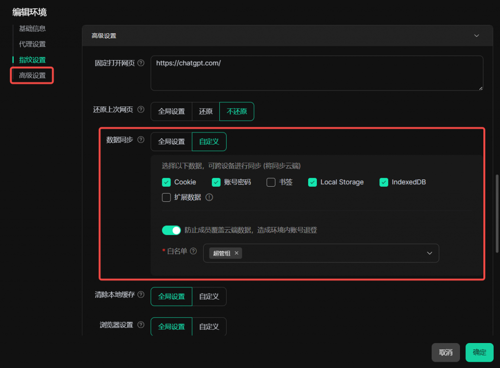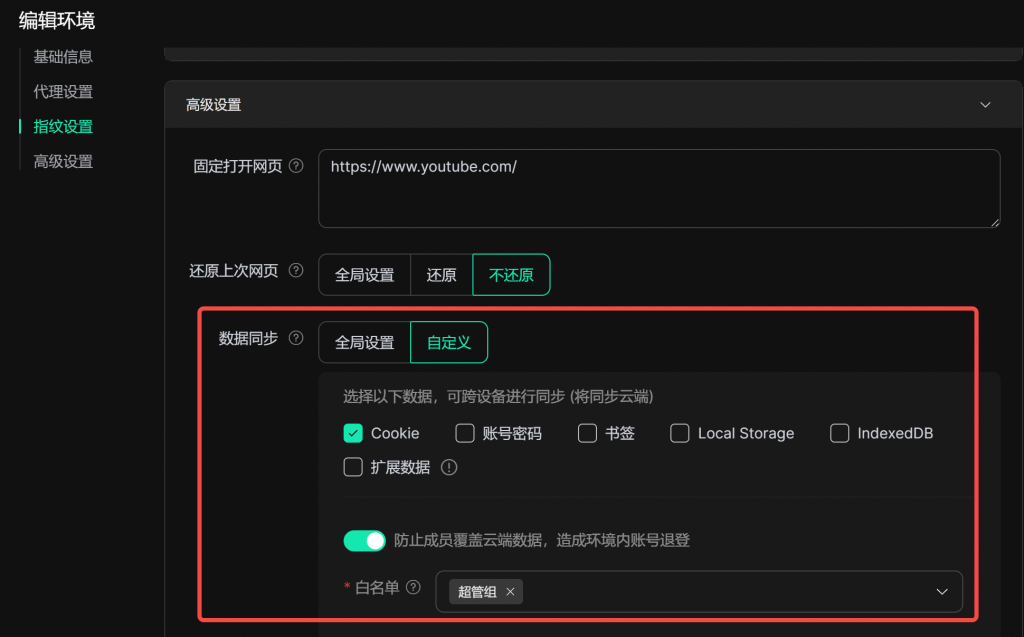 • 高级设置-数据同步,设置为“全局设置”(在【全局设置】板块设置)或“自定义”,勾选Cookie、账号密码、Local StorageIndexedDB。可开启“防止成员覆盖云端数据”并设置白名单为超管组或管理组,即只有白名单的成员在环境中的登录数据可云端同步给其他成员。