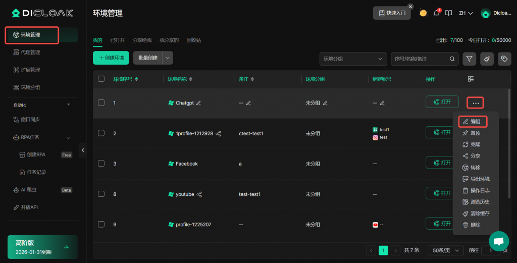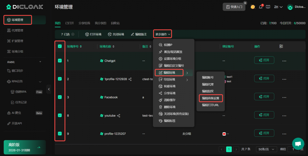• 进入【环境管理】,“编辑”环境;或批量选择环境,点击“更多操作”-“编辑环境”-“批量高级设置”