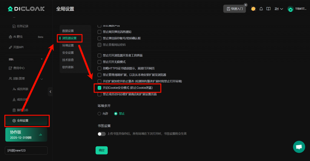 新增【Cookie 加密功能】,支持一键加密现有环境,用于保护环境 Cookie 安全。加密 Cookie 后,任何成员都无法直接盗取/拷贝环境内的 Cookie 数据(如需体验该功能,请联系客服进行设置)。