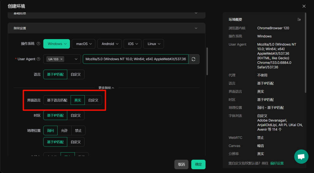 【环境管理-创建/编辑环境】的“界面语言”指纹,新增【真实】选项。使您可在DICloak环境中,使用自身设备语言,从而自动将浏览器的界面语言切换为您所熟悉的语言。