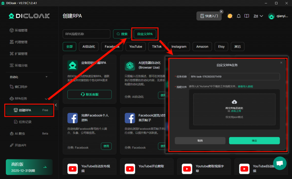 【创建 RPA】新增【自定义 RPA】功能,支持按自身业务需求自由设计工作流程,快速创建贴合场景的个性化 RPA 任务,适配更多定制化自动化需求。查看导入Automa流程教程