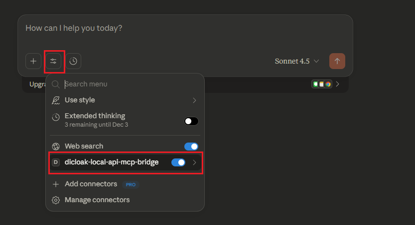 保存 claude_desktop_config.json 文件后,建议重启 Claude Desktop 以确保新配置生效。Claude 重启后,返回其“设置”。在“连接器”部分(根据您的 Claude 版本,该部分可能位于“常规”或“扩展”下),您应该可以看到“dicloak-local-api-mcp-bridge LOCAL”列为已连接的服务。这表示集成成功。
