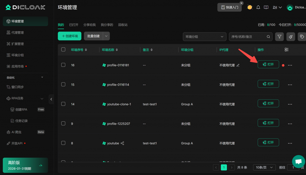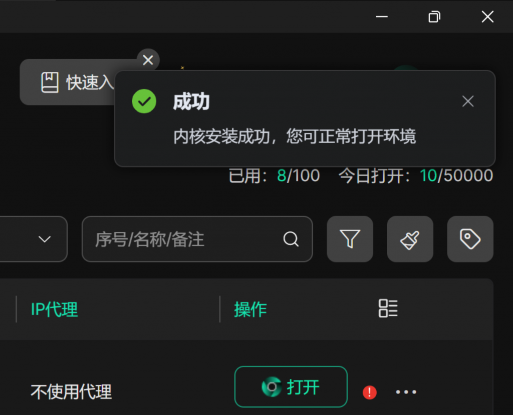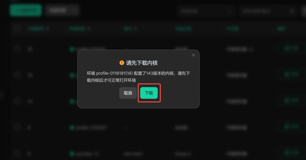 当您在环境的“打开”按钮旁看到“无法找到该环境内核”的提示,说您所用的设备还未下载环境中所配置的浏览器内核。(目前环境支持配置浏览器内核120、134、142和143版本,选择哪个则成员的设备中需下载相对应的内核版本)