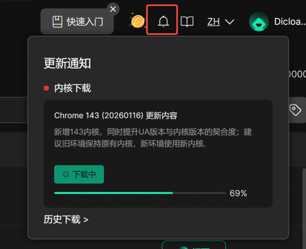 - 此时右上角可看到下载进程,请耐心等待下载完成。如果不慎关闭了该弹窗,您可以点击右上角的“通知”图标查看最新进程(如通知内未显示下载进程,则说明已下载完成)